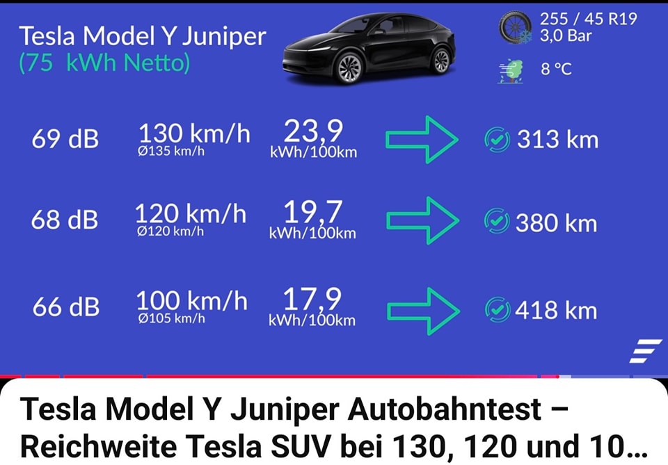 2. 겨울 8도에서 각 속도별로 모델Y 주니퍼로 테스트 결과