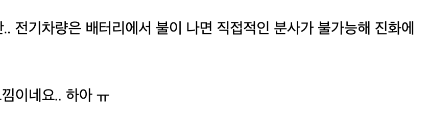 사실 이 이슈는 소개하기 상당히 민감한 부분이다. 분명히 전기차 화재로 큰 피해가 발생할 수 있고, 특히 전기차는 화재 발생 시 진화가 쉽지 않은 것은 팩트이긴 때문이다. 전기차를 옹호한다