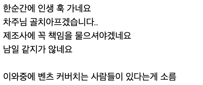개돼지들이 많아서, 이번 화재사건만 뭉개면 벤츠코리아는 속으로 걱정할 필요 없을 거래 생각할 듯.