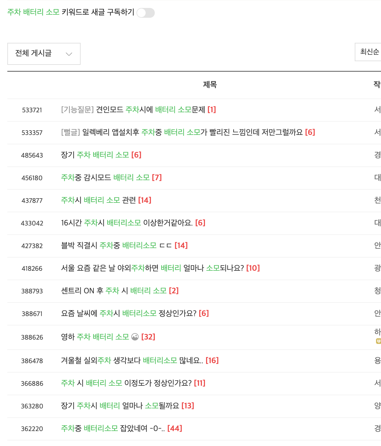 주차를 장기간 해서 배터리가 눈에 띄게 주는 경우는 아예 없었다.