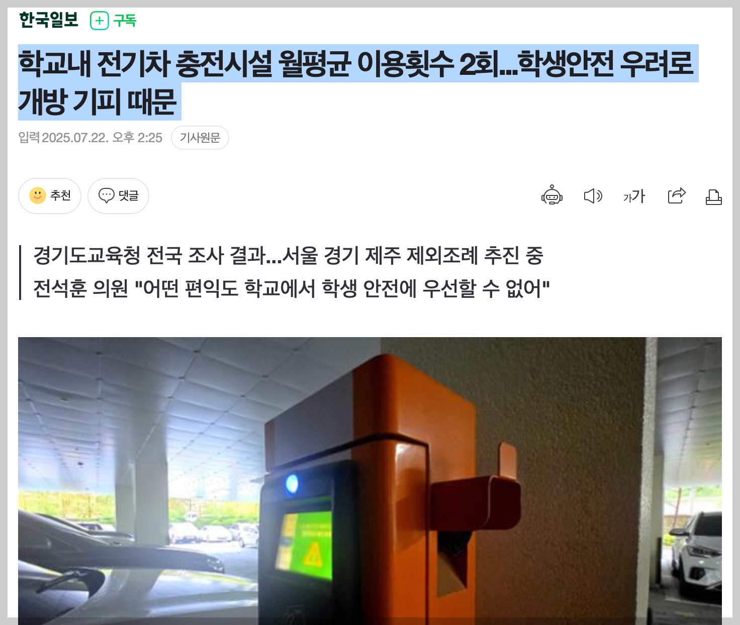 학교내 전기차 충전시설 월평균 이용횟수 2회...학생안전 우려로 개방 기피 때문