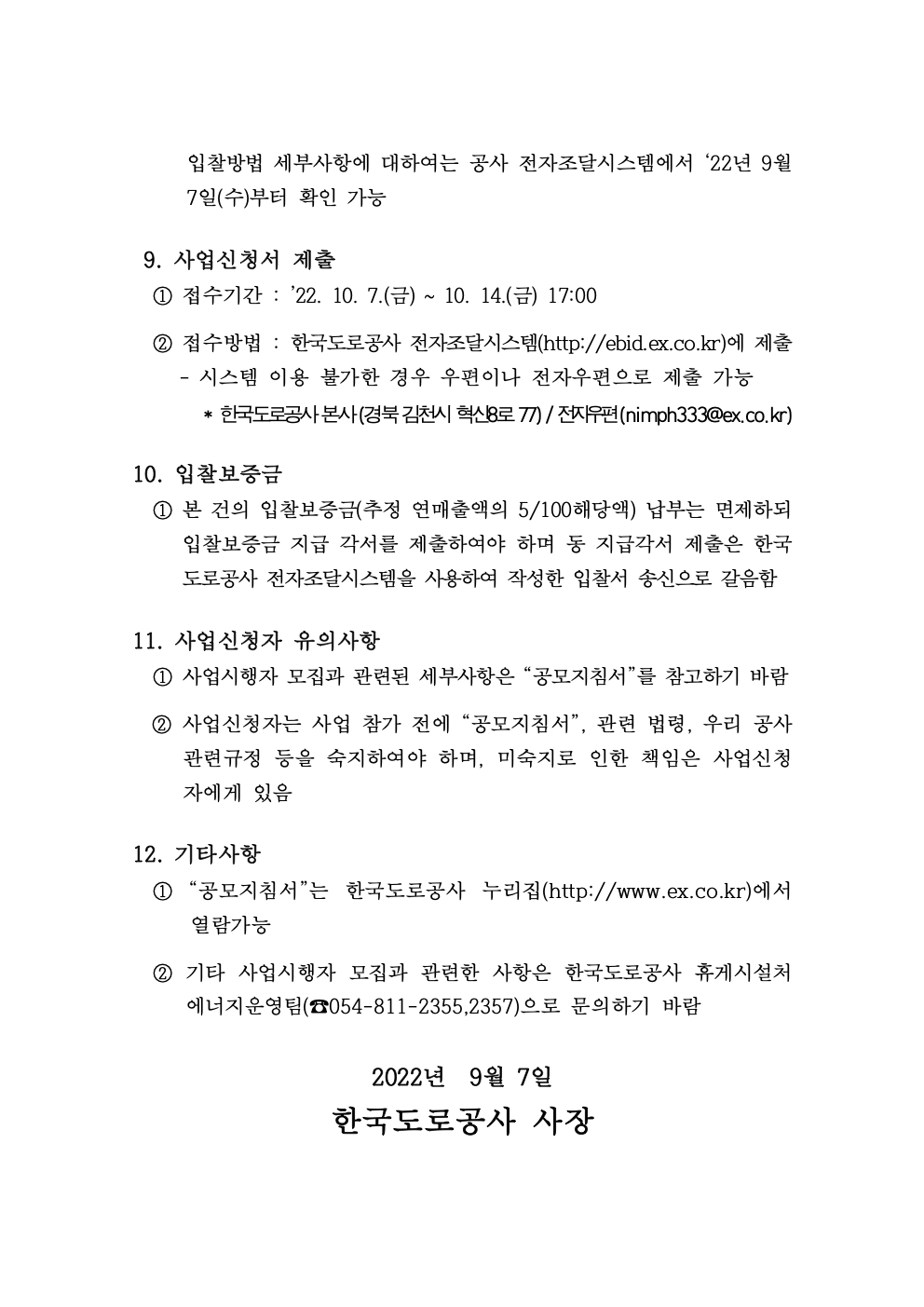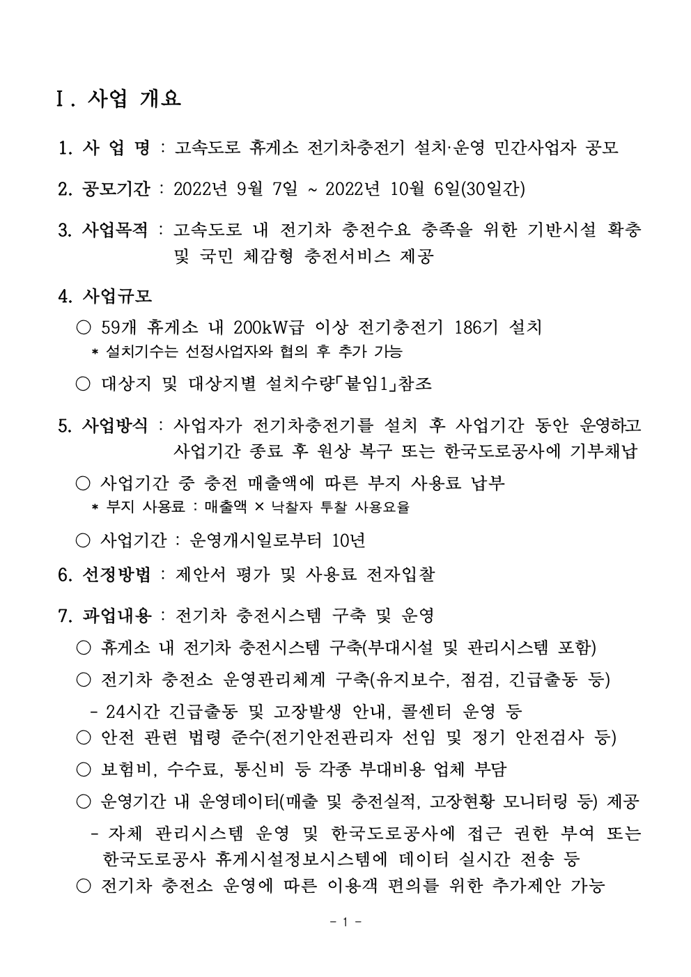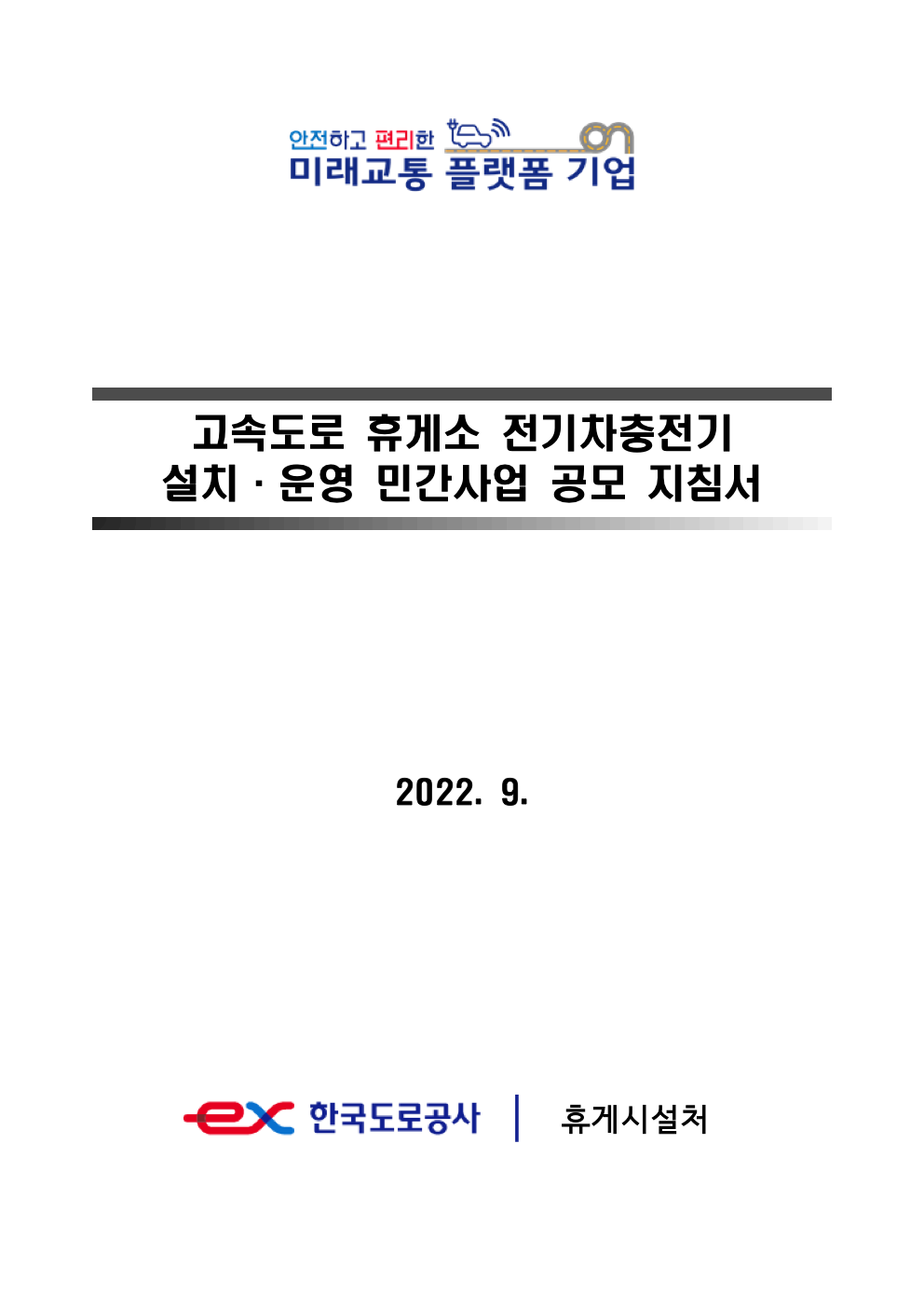 | 고속도로 휴게소 전기차충전기 설치·운영 민간사업자 공모를 위한 모집공고문, 공모지침서 등 알림 | 2022-09-07 |