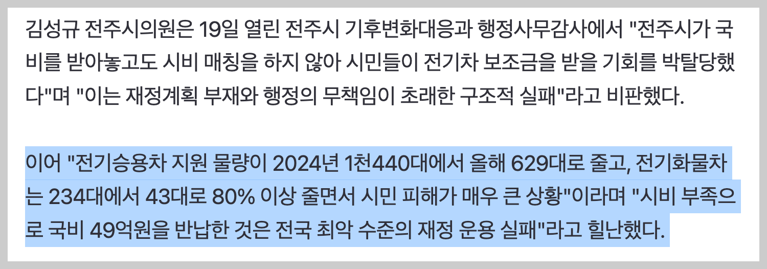 전북 전주시가 올해 전기차 보조금의 시비를 확보하지 못해 국비 49억원을 반납한 것을 두고 "시의 재정 운용 실패"라는 성토가 나왔다. 김성규 전주시의원은 19일 열린 전주시 기후변화대응과