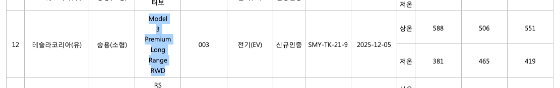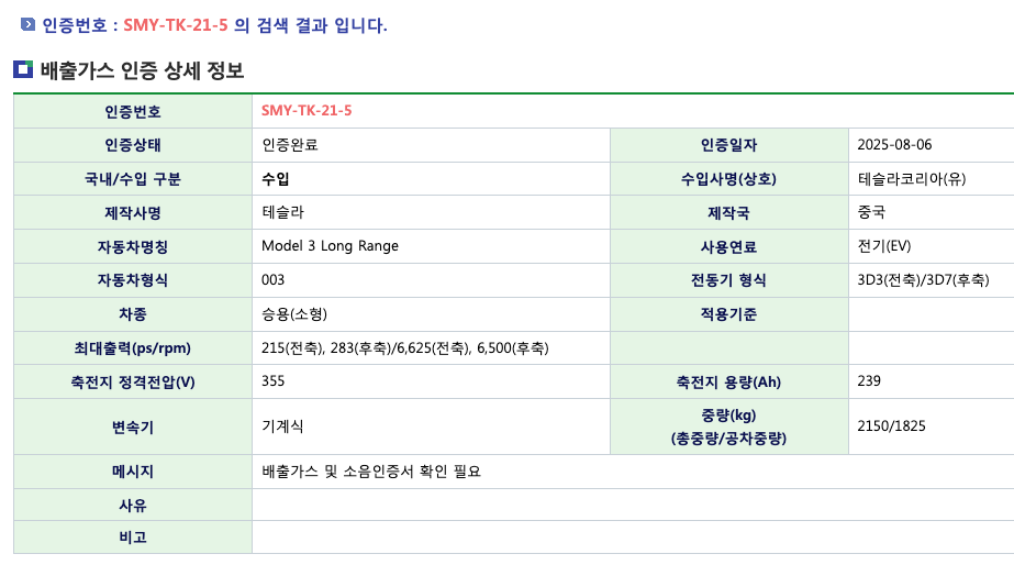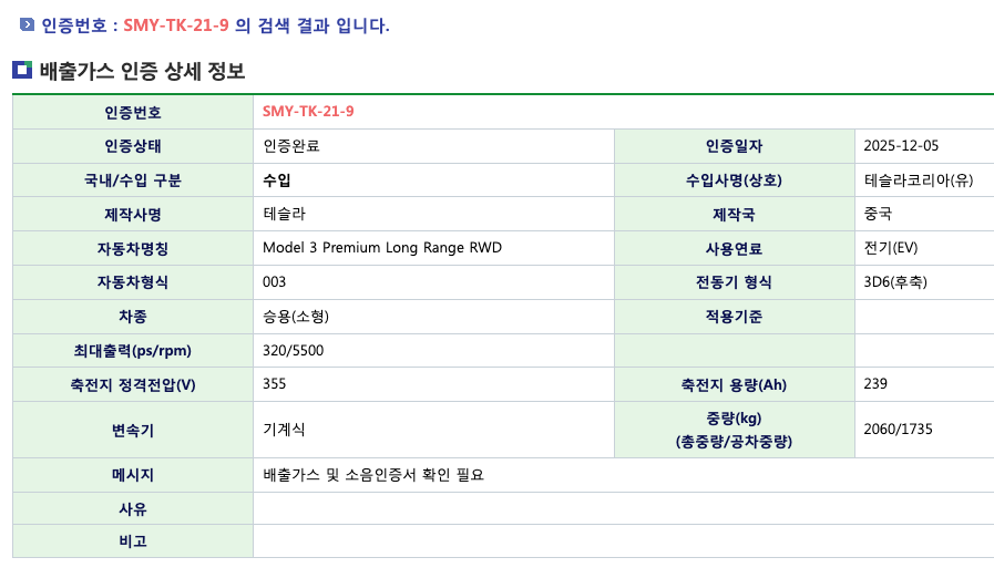 모델3 RWD 롱레인지 모델을 인증 받음.