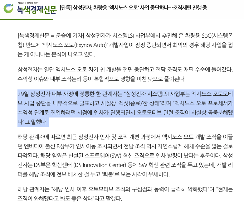 [단독] 삼성전자, 차량용 '엑시노스 오토' 사업 중단하나…조직재편 진행 중 - 녹색경제신문