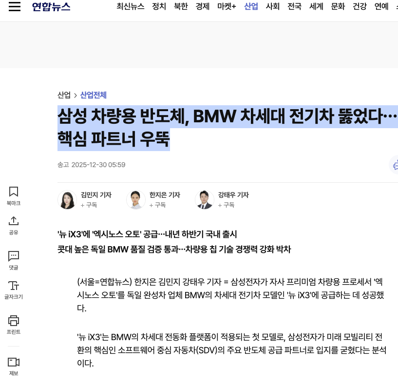 삼성 차량용 반도체, BMW 차세대 전기차 뚫었다…핵심 파트너 우뚝 | 연합뉴스