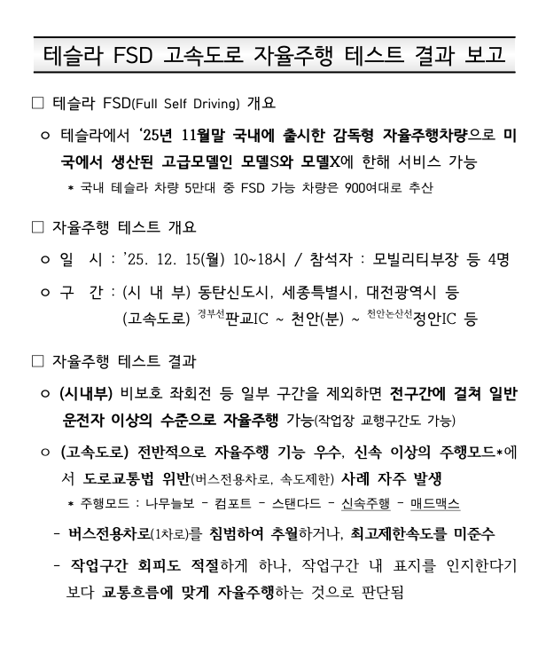 [엠투데이 이정근기자] 한국도로공사가 작년 12월 테슬라의 FSD 감독형 기능에 대한 실제 주행 테스트를 진행한 것이 확인됐다. 정보공개포털에 비공개로 게재된 자료에 따르면 12월 15일 10시부터