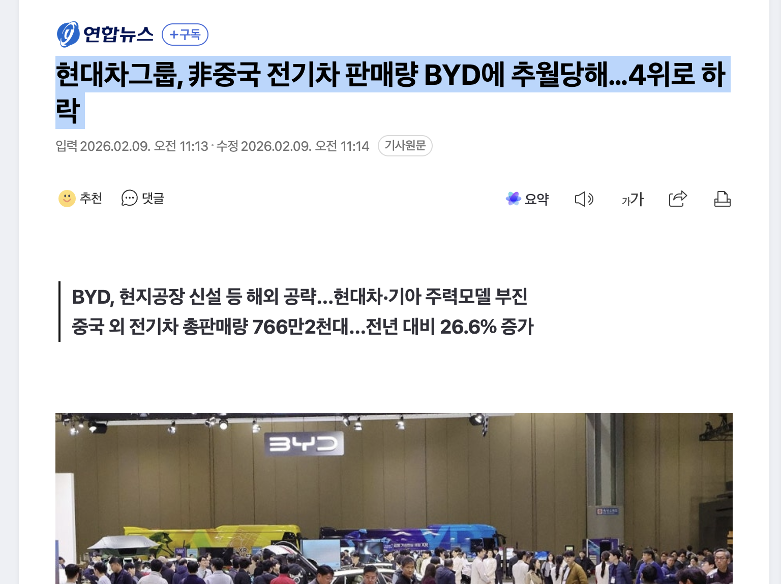 BYD, 현지공장 신설 등 해외 공략…현대차·기아 주력모델 부진 중국 외 전기차 총판매량 766만2천대…전년 대비 26.6% 증가 현대차그룹이 지난해 비(非)중국 전기차 시장에서 중국 전기차업체 BYD