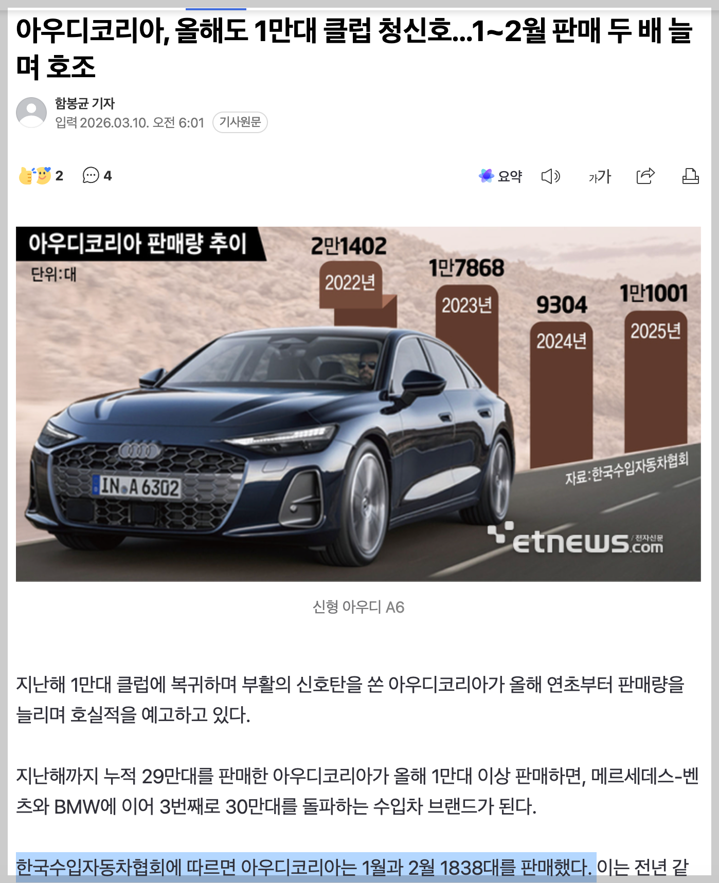 아우디코리아, 올해도 1만대 클럽 청신호...1~2월 판매 두 배 늘며 호조