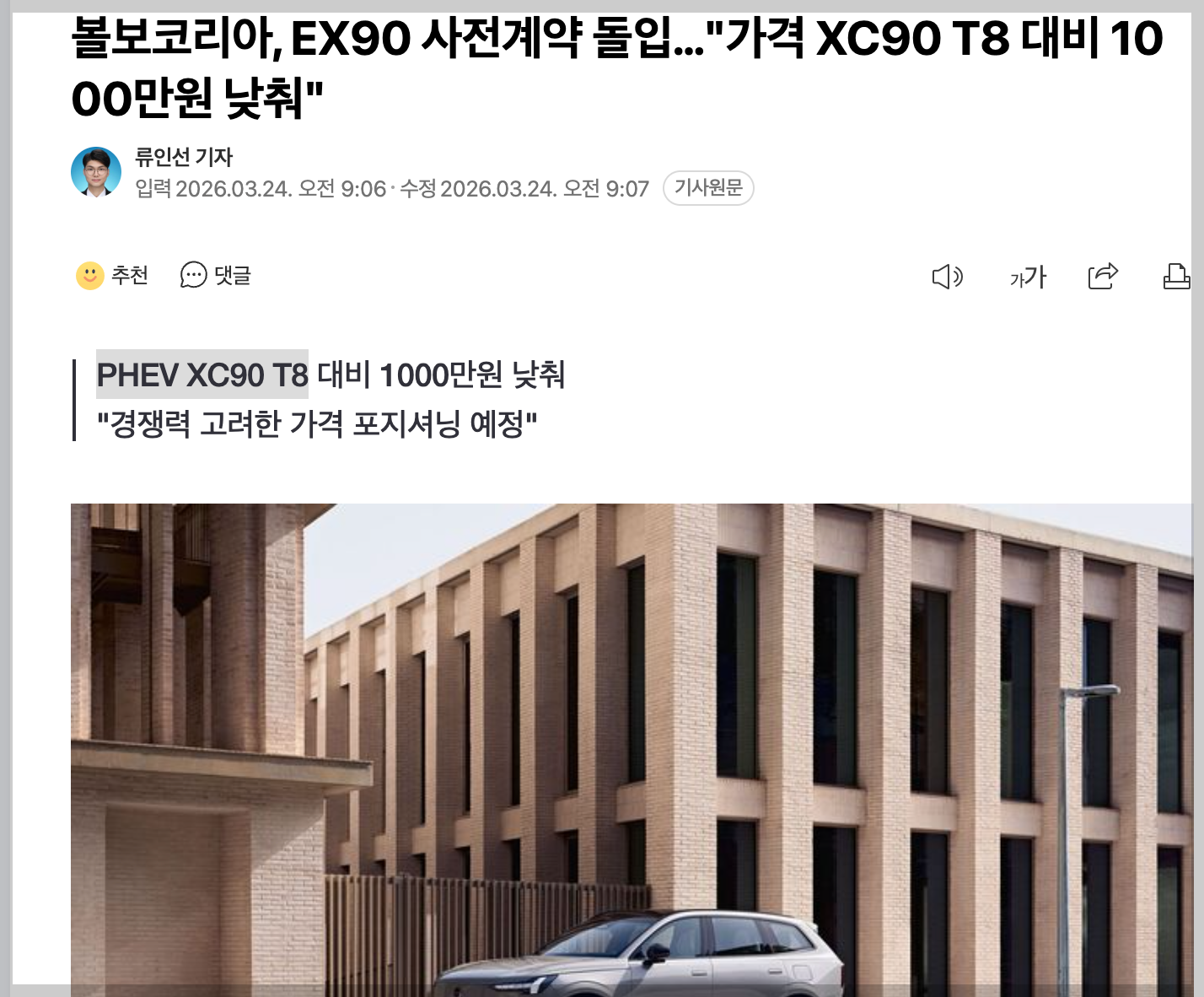 EX90 가격이 XC90 플러그인하이브리드 대비 1천만원 아래...
