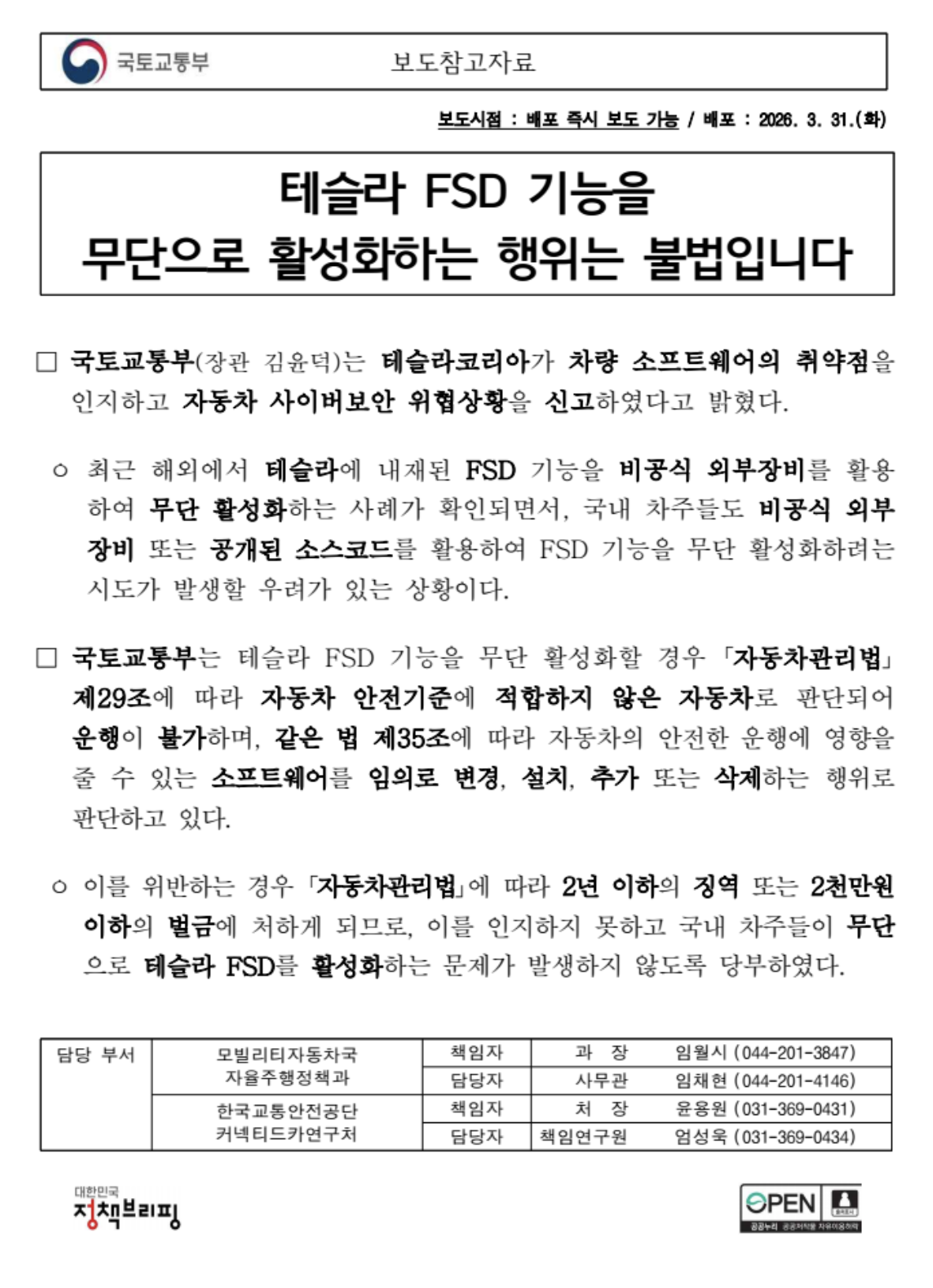 미국산 외 모델Y 등 소프트웨어 임의 변경 시 자동차관리법 위반 국토교통부는 국내에서 테슬라 일부 모델의 완전자율주행(FSD) 기능을 무단으로 활성화하려는 시도가 엄연한 불법이라며 차주들