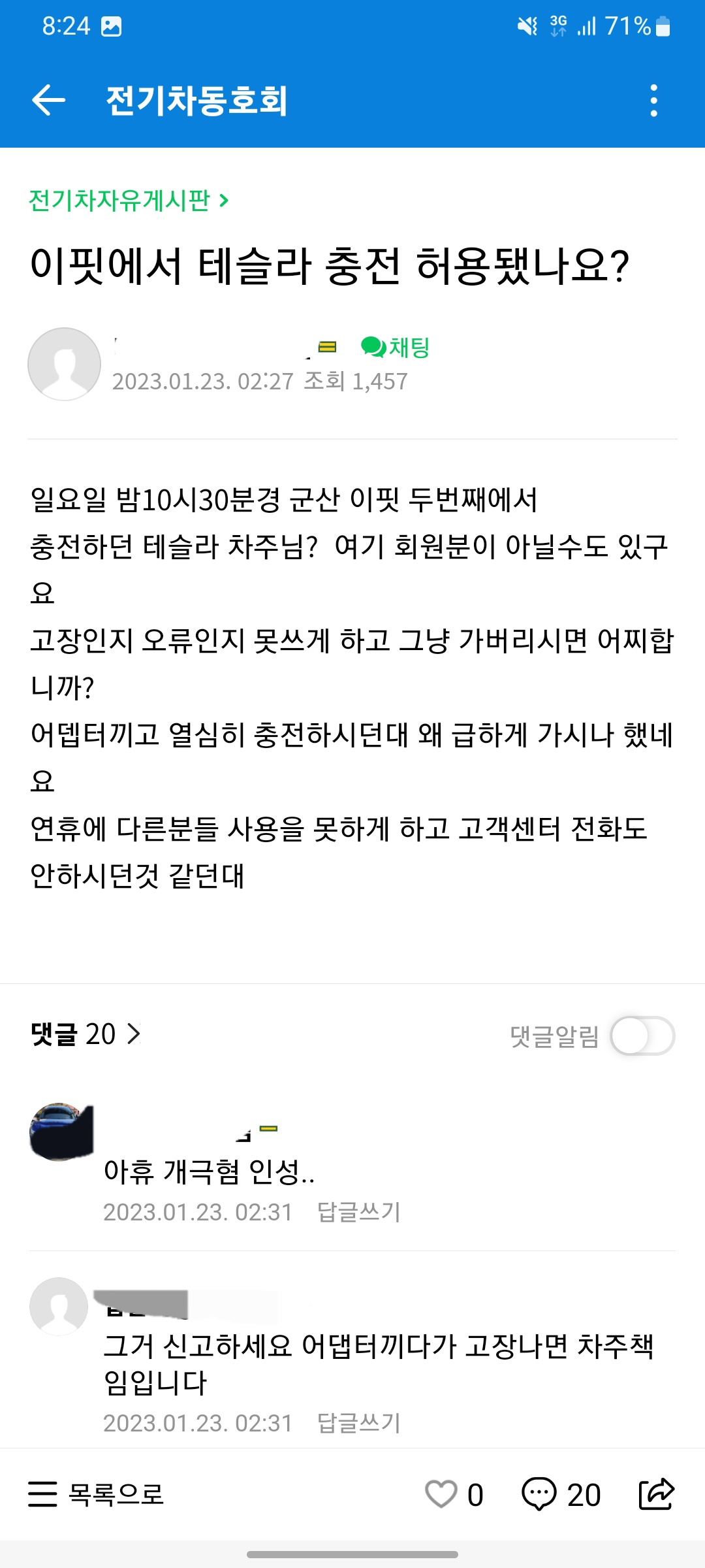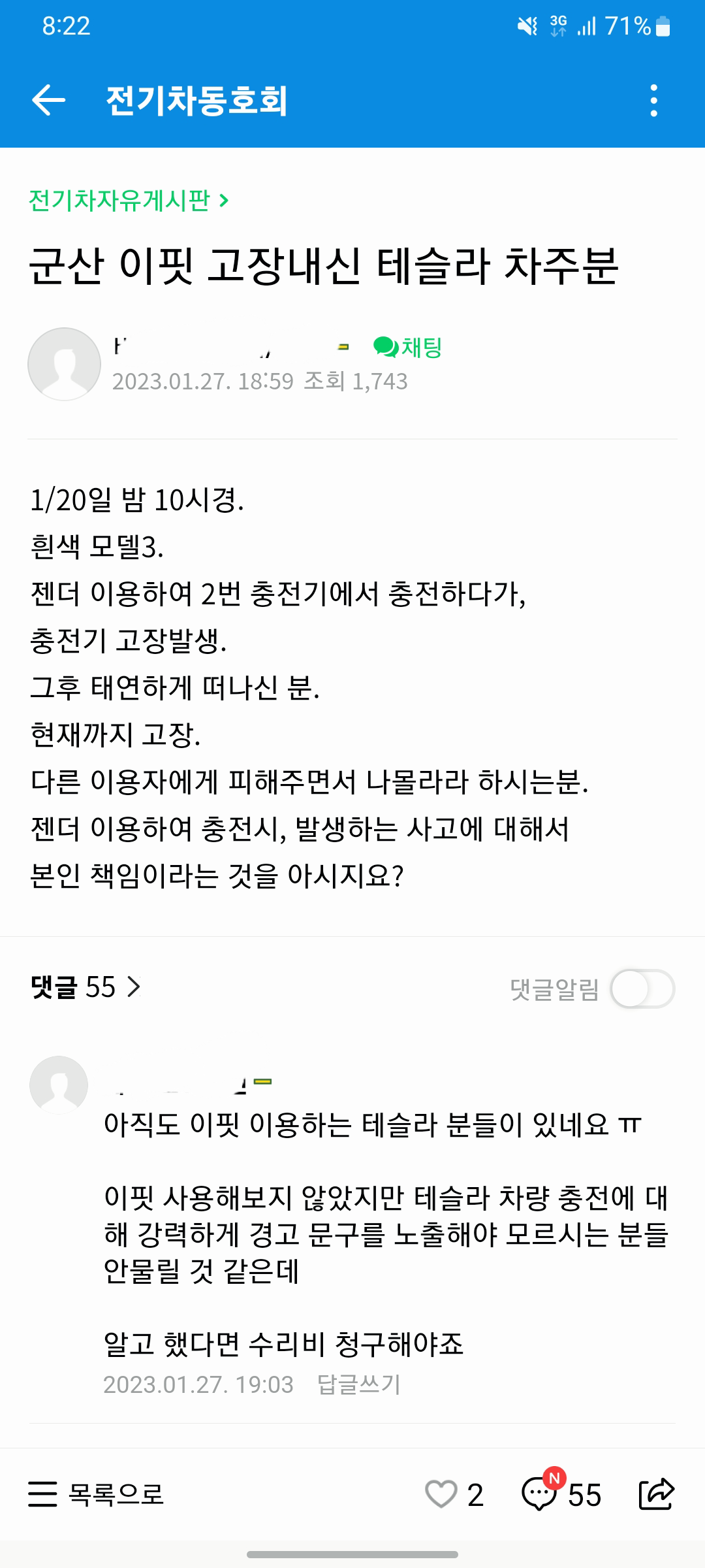 당당하게 후기를 작성하는 테슬라 카페 회원...