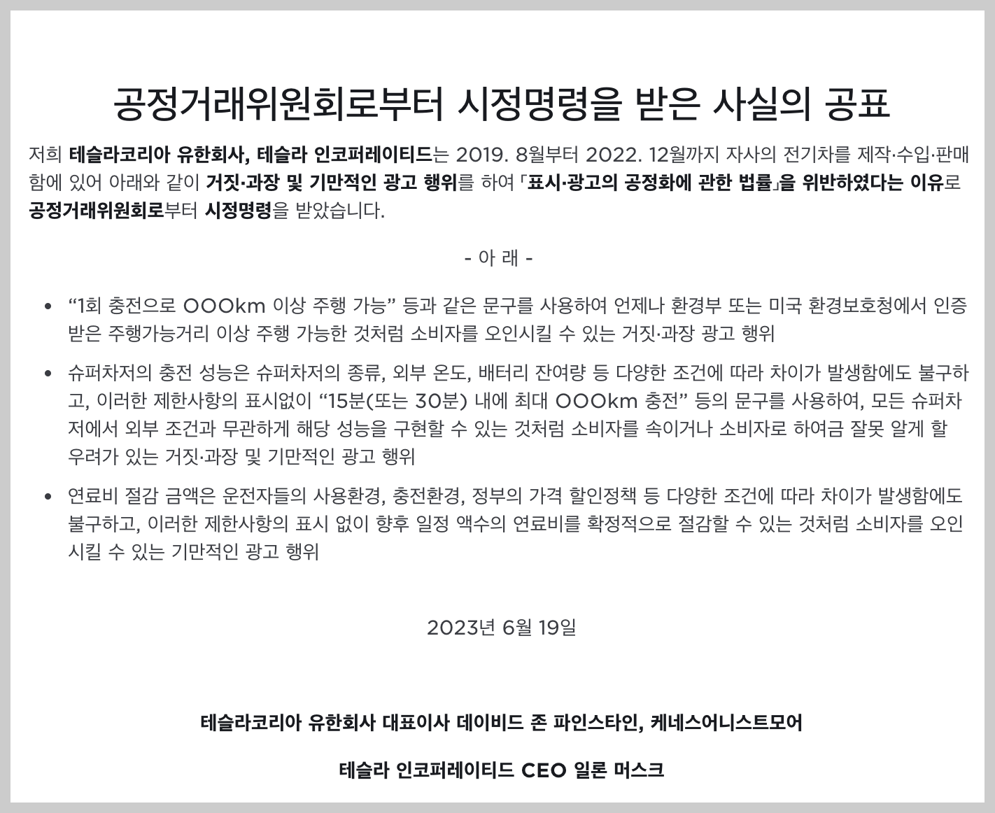 저희 테슬라코리아 유한회사, 테슬라 인코퍼레이티드는 2019. 8월부터 2022. 12월까지 자사의 전기차를 제작·수입·판매함에 있어 아래와 같이 거짓·과장 및 기만적인 광고 행위를 하여 「표시·광고의 공정화에 관한 법률」을 위반하였다는 이유로 공정거래위원회로부터 시정명령을 받았습니다.