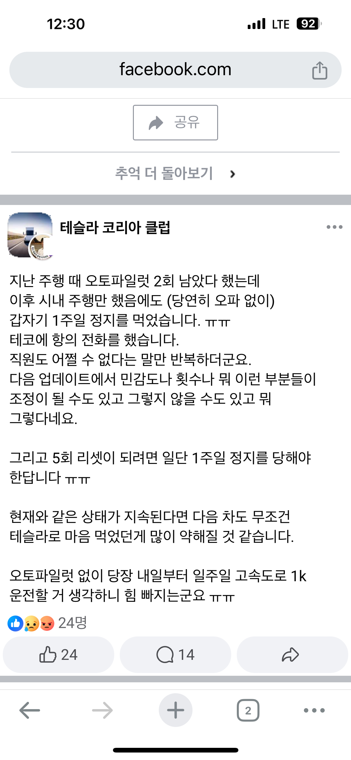 가장 황당한 아래 반응을 보면, 오토파일럿이 없으면 운전을 하기 어렵다는 식의 말...