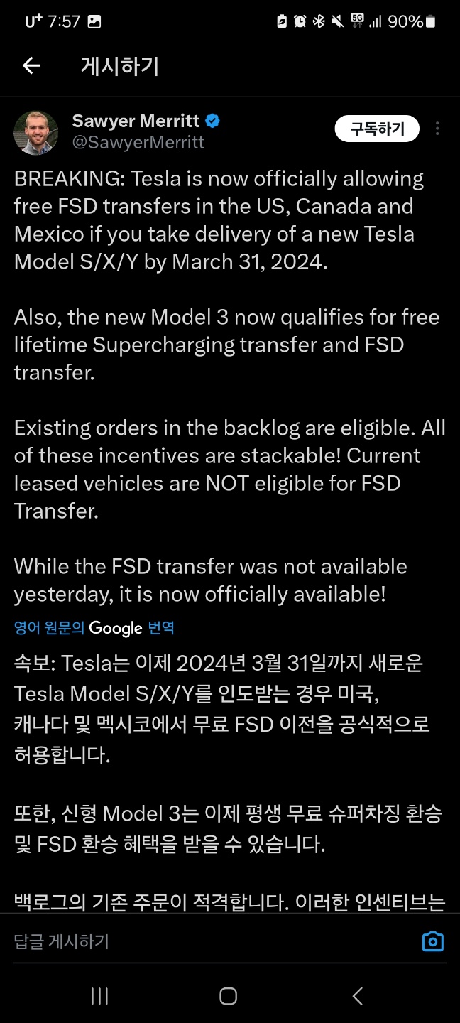 북미에서 테슬라 'FSD/무제한슈차 이전' 다시 시작 본문