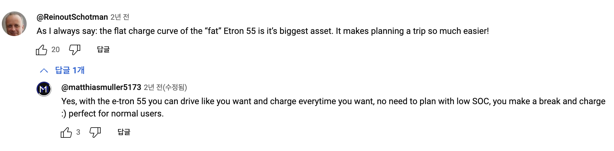 실제 유튜브 댓글들을 보면 이트론55는 장거리 여행에서 유용하다는 점을 강조하고 있음.