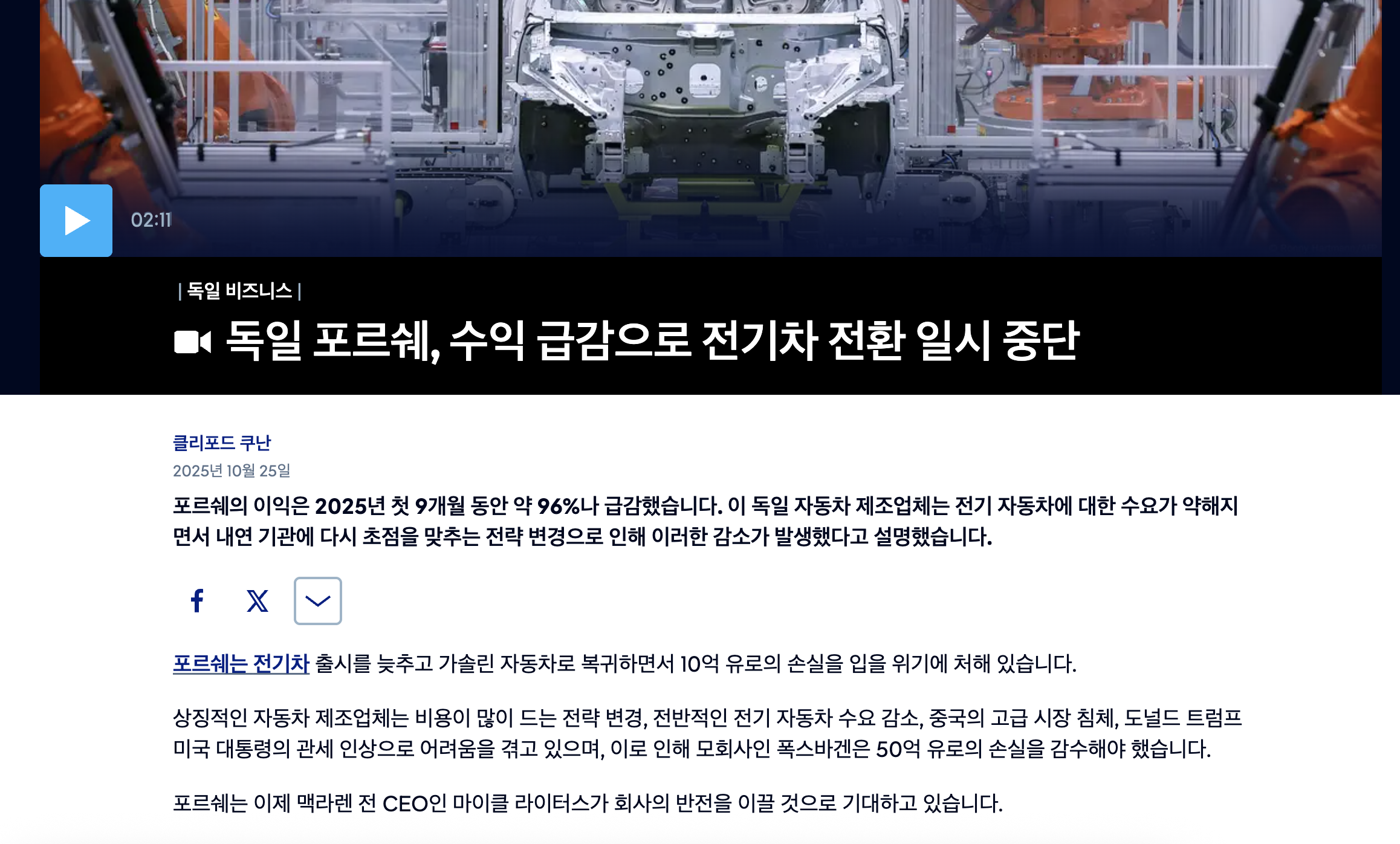 독일 스포츠카업체 포르쉐가 전기차 전략 전환과 중국 시장 부진, 미국 관세 등 삼중고에 직면하면서 올해 영업이익이 작년보다 99% 감소했다. 포르쉐는 24일(현지시간) 실적발표에서 올해 1∼3