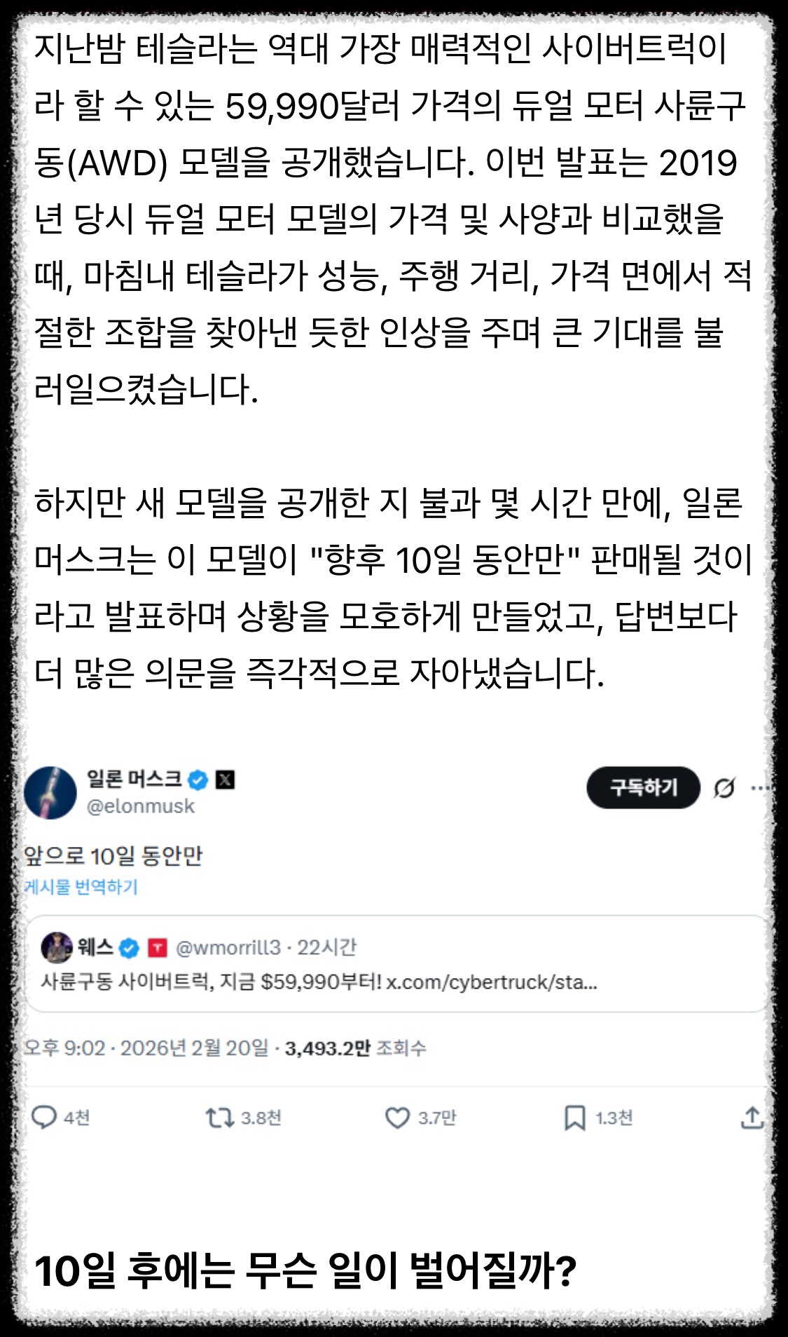 사이버트럭 최하위 트림 신규 출시.1. AWD, 에어서스 없고 직물시트, 스피커 7개 등 옵션이 대거 제거가격은 59990달러... 6만 달러... 한화 약 9천만원.(미국서는 사트 이 트림이 모델Y 퍼포먼스 살 가